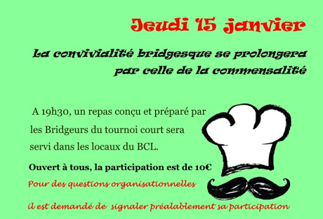 Jeudi 15 à 19h30, un repas aura lieu pour les habitués du jeudi et ouvert à tous. La participation est de 10 € par personne. Ce repas sera conçu et préparé par les joueurs du jeudi soir.