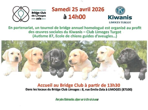 - L'inscription se fait sur place, ou en ligne dans votre espace licencié ffb.fr - Paiement par chèque sur place le jour du tournoi, à l'ordre du Kiwanis-Club Limoges Turgot - Droit d'engagement : 20€ par joueur - Pot amical à la fin du tournoi